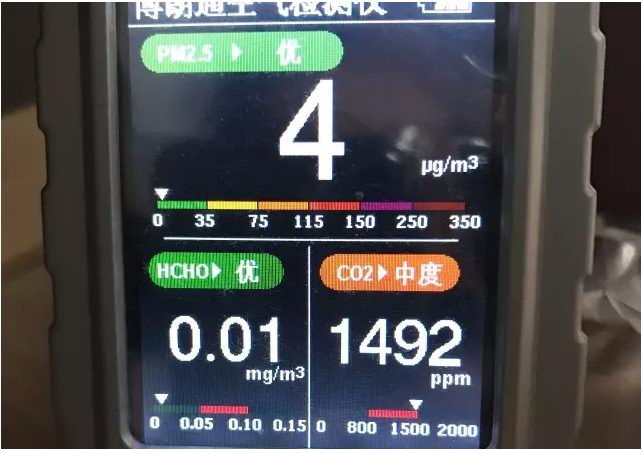 測試顯示:PM2.5數(shù)值顯示優(yōu),只有4,甲醛濃度也OK,但是CO2二氧化碳濃度接近1500ppm,顯示中度超標(biāo)。百度百科上給出了二氧化碳濃度含量會(huì)影響人類的生活作息,揭示了濃度含量與人體生理反應(yīng)如下: